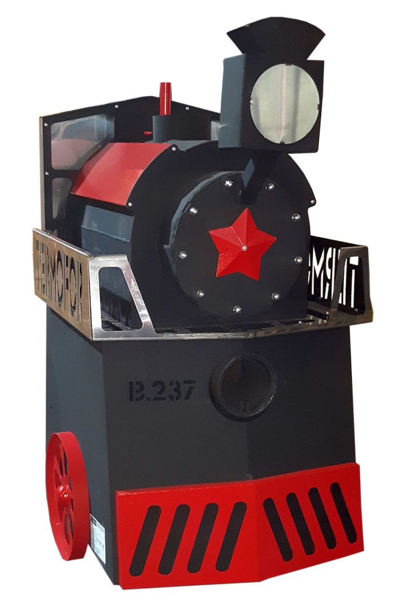 Комплектация: печь «Паровоз 14‑18», чугунная дверца со стеклом, паровозный свисток, «паровозная фара», выдвижной зольник, выносной топливный канал.