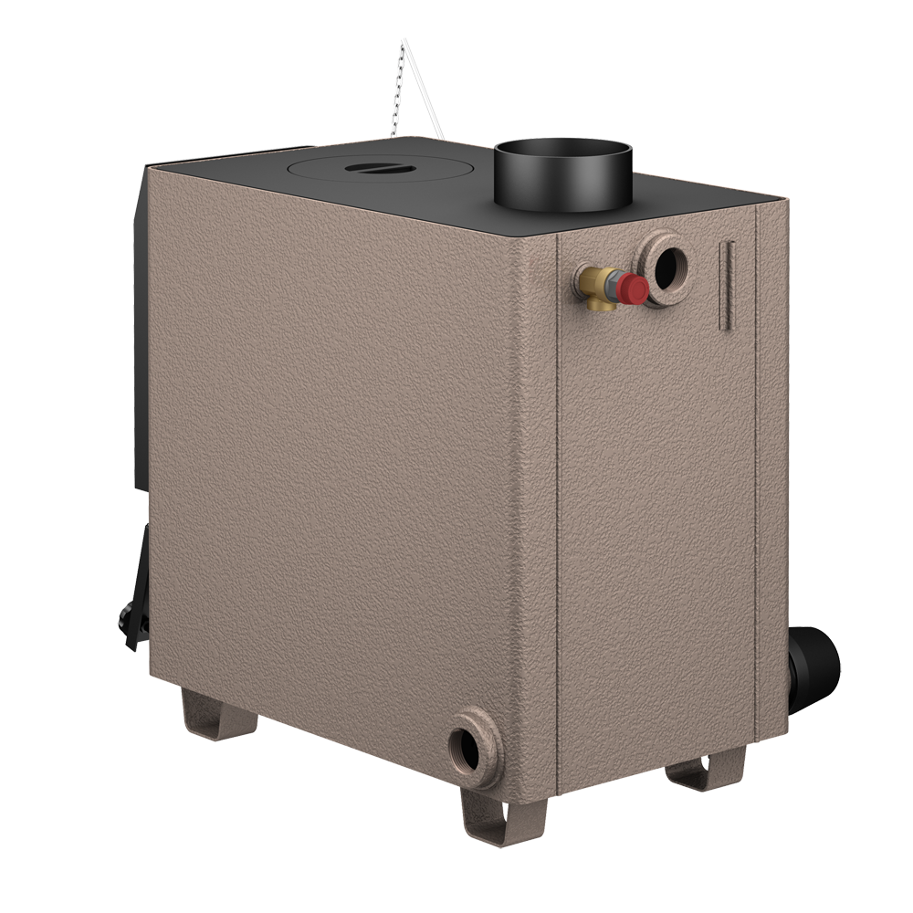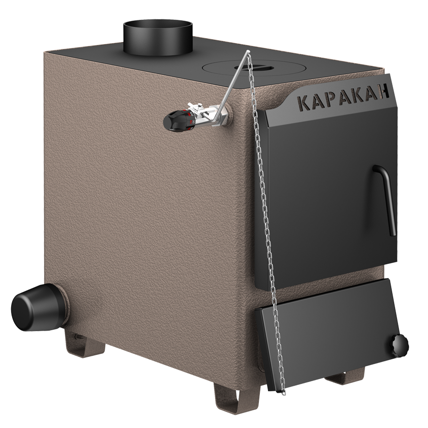Твердотопливный котел Каракан-8 ТПЭ 3 имеет длинную топку (48,5 см), позволяющую топить как углем, так и дровами. Еще одна изюминка котла - вертикальный дымоход, вмонтированный в варочную панель. Для увеличения высоты котла используется специальная подставка. Её корпус выполнен в едином дизайне и снабжен выкатным ящиком. Подсоединение котла к кирпичной дымовой трубе производится через стальной переходник дымохода 7-11 КВ-ПГ. Этот переходник позволяет вывести дымоход не только назад, но и вбок.